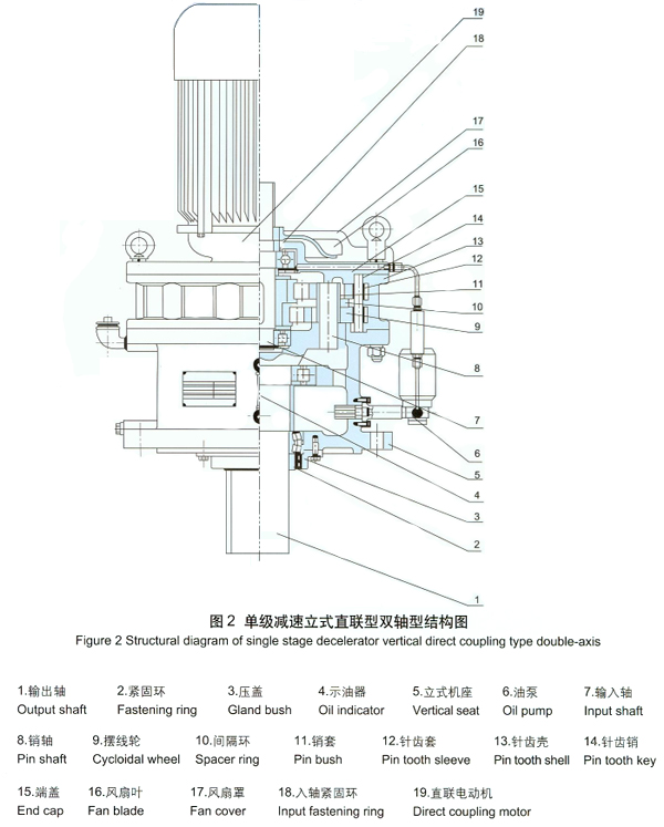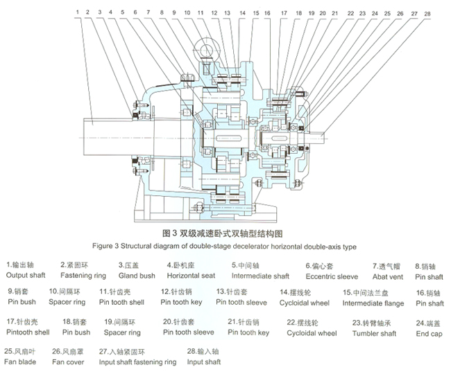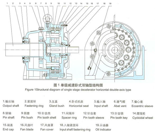 擺線針輪減速機(jī)全部傳動(dòng)裝置可分為三部分:輸入部分.減速部分、輸出部分。
