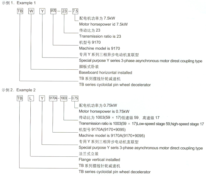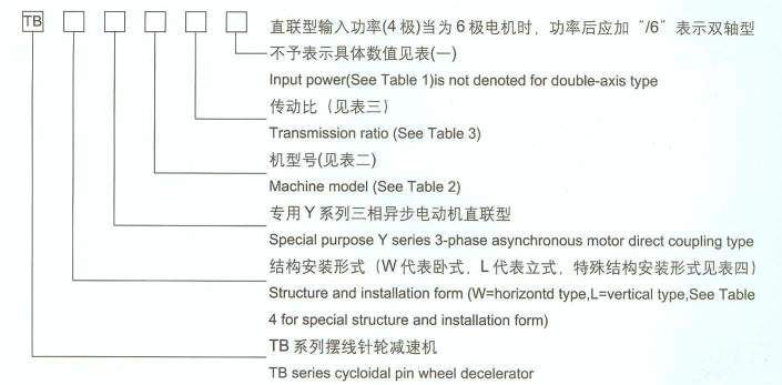 三、型號(hào)及規(guī)格 1、型號(hào)說(shuō)明 TBW擺線針輪減速機(jī)為雙軸型、腳板式臥式安裝 TBL擺線針輪減速機(jī)為雙軸型、法蘭式立式安裝 TBWY擺線針輪減速機(jī)為專(zhuān)用異步電機(jī)直聯(lián)型、腳板式臥式安裝 TBLY擺線針輪減速機(jī)為專(zhuān)用異步電機(jī)直聯(lián)型、法蘭式立式安裝